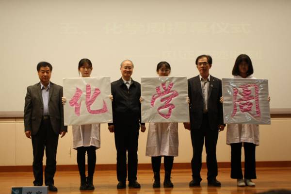 庞代文教授、蔡红生副校长和肖文精院长开启了化学周的揭幕仪式。随着三位嘉宾向写有“化学周”三个大字的幕布上喷洒稀的碱性溶液,火红的“化学周”字样逐渐显现在观众面前。该实验利用酚酞遇碱变红的原理,体现了化学的趣味及魅力。鲜艳的红色象征青春的活力与热情,颜色的变化象征青春芳华放飞梦想,完美地契合了本次活动的主题“青春梦,化学心”。观看过程中,同学们热情高涨,鼓掌喝彩。蔡红生副校长为庞代文教授颁发第200期“博雅大讲堂”主讲人聘书,与会嘉宾合影留念后,第十一届化学周开幕式圆满结束,化学周系列活动正式拉开序幕。