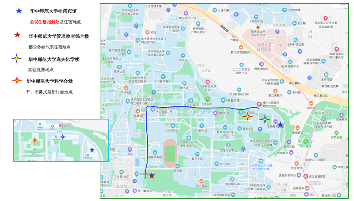 报到地点:华中师范大学桂苑宾馆一楼大厅(武汉市洪山区珞喻路152号)。为避免人员聚集,本次会议不设集中接站,会务组统一在华中师范大学北门外设接待点,由校园电动车送各位参会代表前往桂苑宾馆报到。机场及各火车站前往华中师范大学北门(广埠屯)的交通指南见附件。